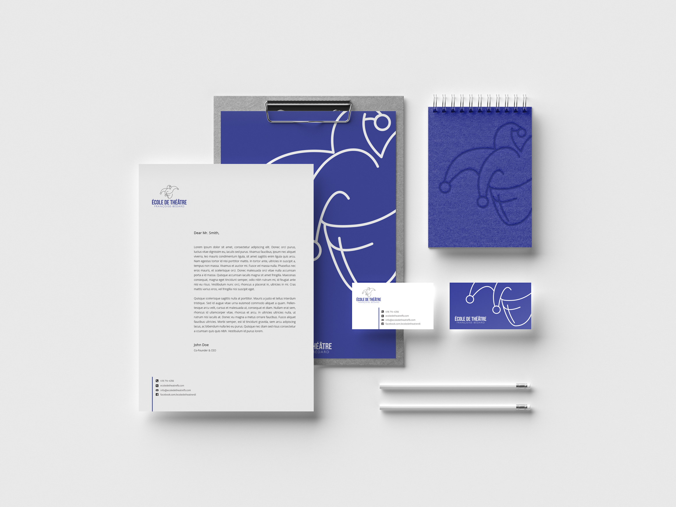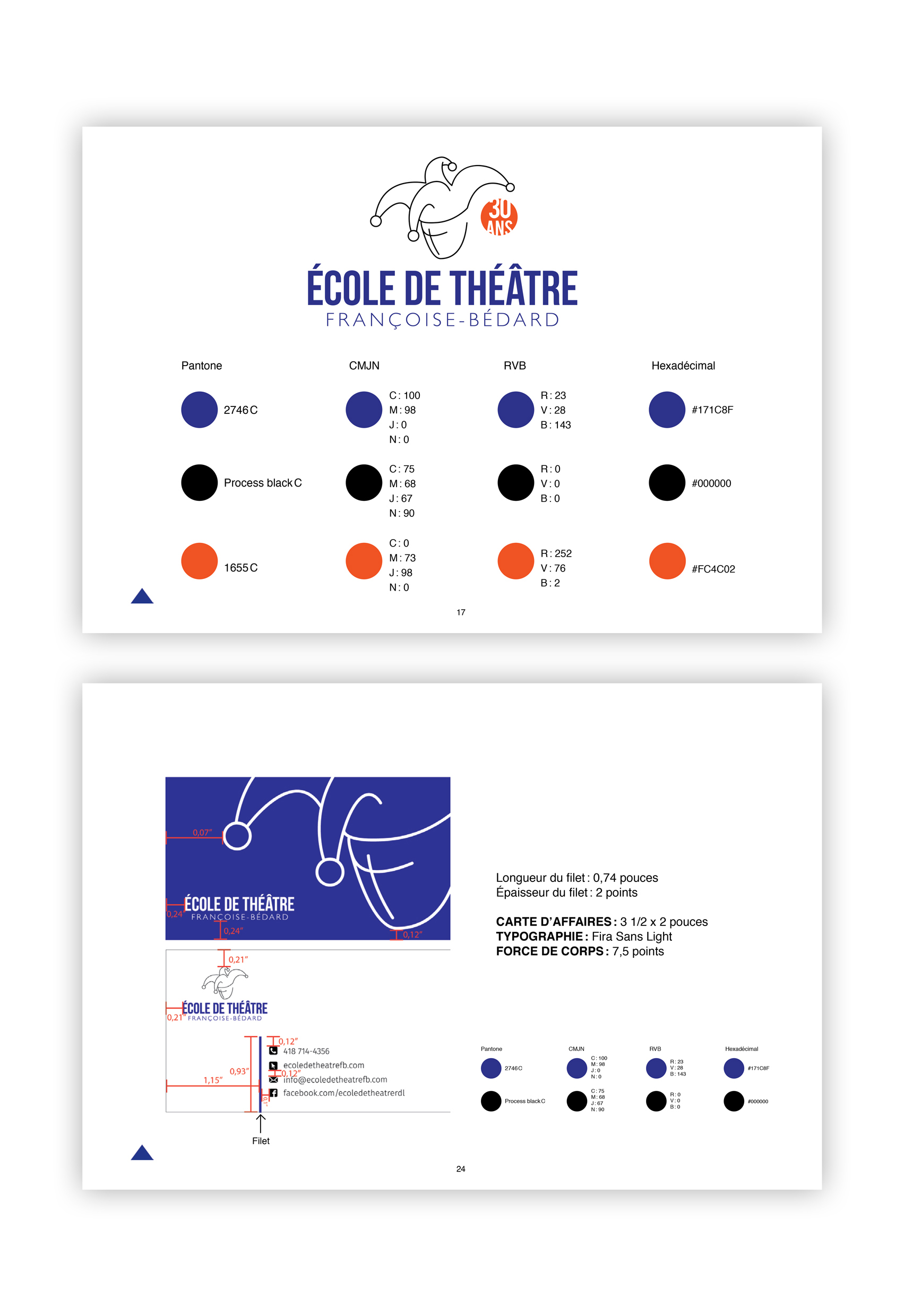 L’École de théâtre Françoise-Bédard décide pour ses 30 ans de renouveler toute son identité graphique. Composée initialement d’un arlequin, figure célèbre dans le théâtre et facilement reconnaissable, un travail a été effectué autour de ce personnage pour qu’il soit modernisé, notamment en utilisant un tracé simplifié qui représente le dynamisme, l’ouverture d’esprit et le mouvement présents dans le théâtre.