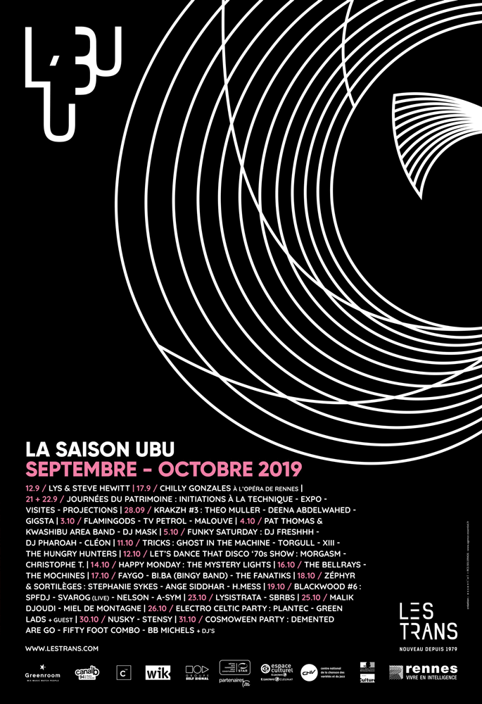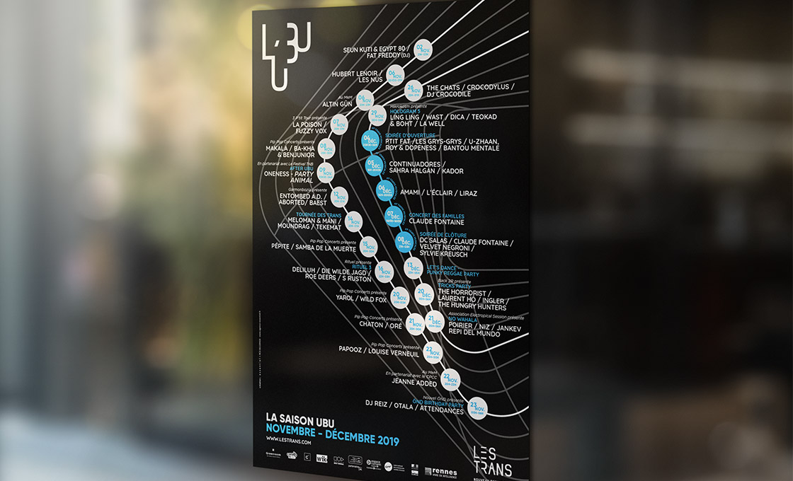 Pour créer l’univers visuel de la salle de concert de l’UBU, un lien évident devait exister avec l’identité du festival Les Trans Musicales. L’enjeu, concevoir un univers parallèle, aux codes visuels en résonance avec ceux du festival afin d’identifier le lien entre ces deux entités de l’association Les Trans.