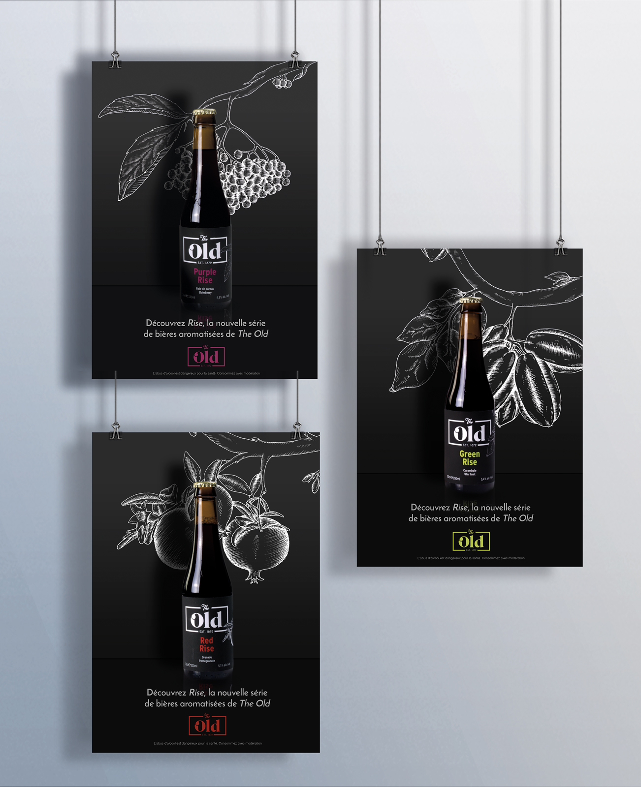 The Old est une marque d’alcool qui lance une nouvelle série de bières, Rise, des bières aromatisées haut de gamme (of high quality), brassées main. La typographie utilisée pour le logo associée aux illustrations, similaires aux anciennes gravures, habillant les packagings permettent de mettre en avant les valeurs de la marque : tradition, haut de gamme et fait-main.
