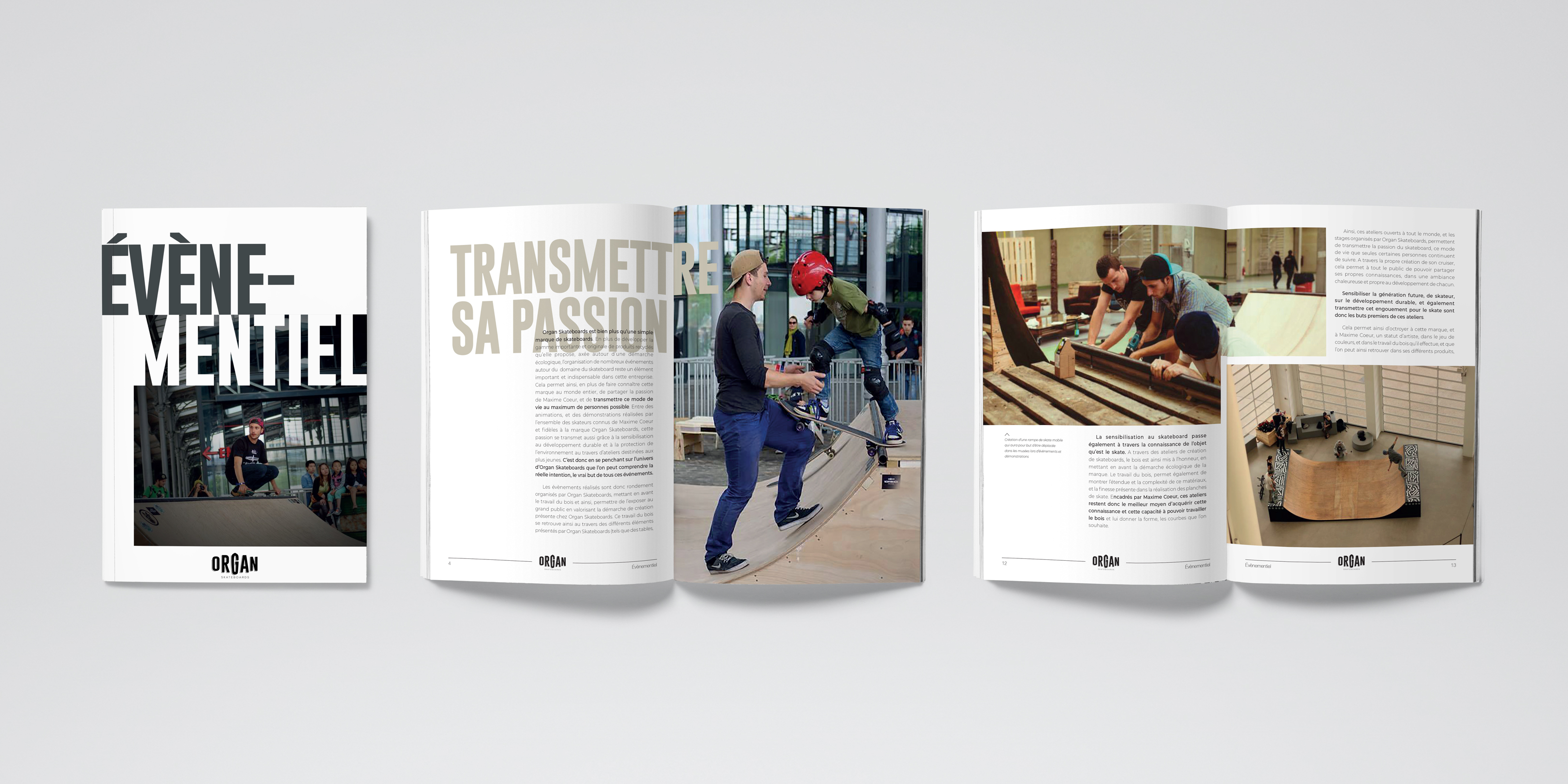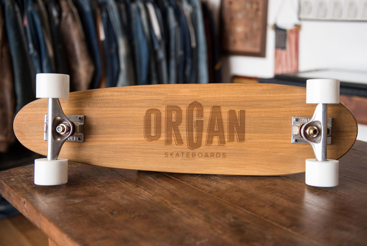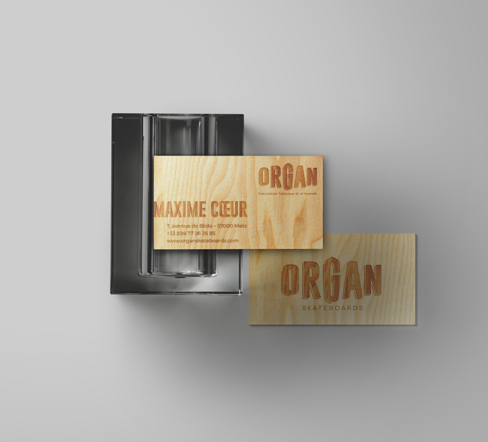 Organ Skateboards est une marque de skate qui crée des cruisers à partir de vieilles planches de skate récupérées. Dans une démarche écologique, tout le bois est récupéré, si bien que les chutes de bois servent aussi à créer divers autres objets (monture de lunettes, coque d’iphone, etc.). Au travers du logotype et du branding développés, les notions de qualité et de haut de gamme du reshape sont représentées par les lignes et le travail autour de la forme particulière de ces cruisers.