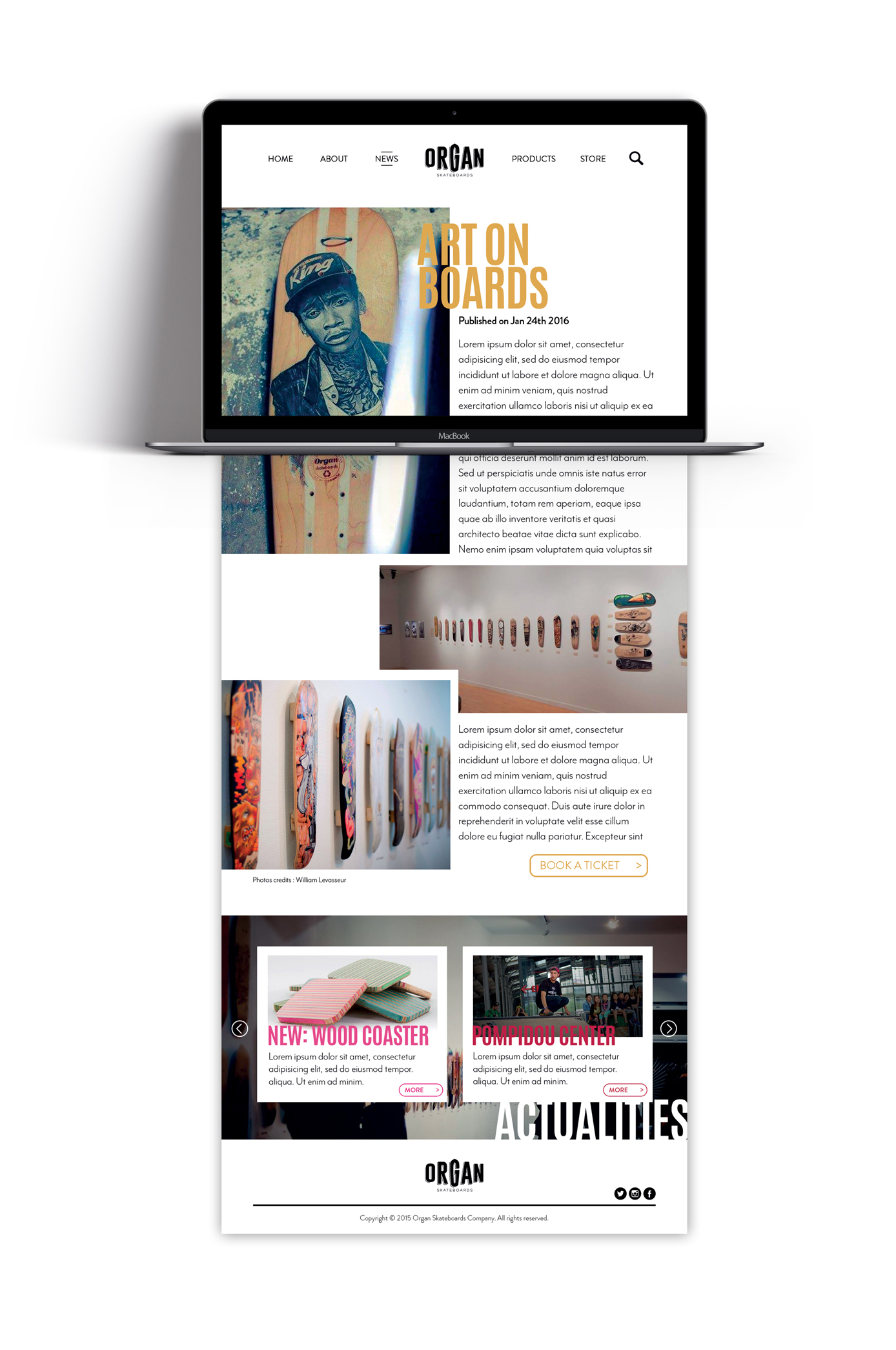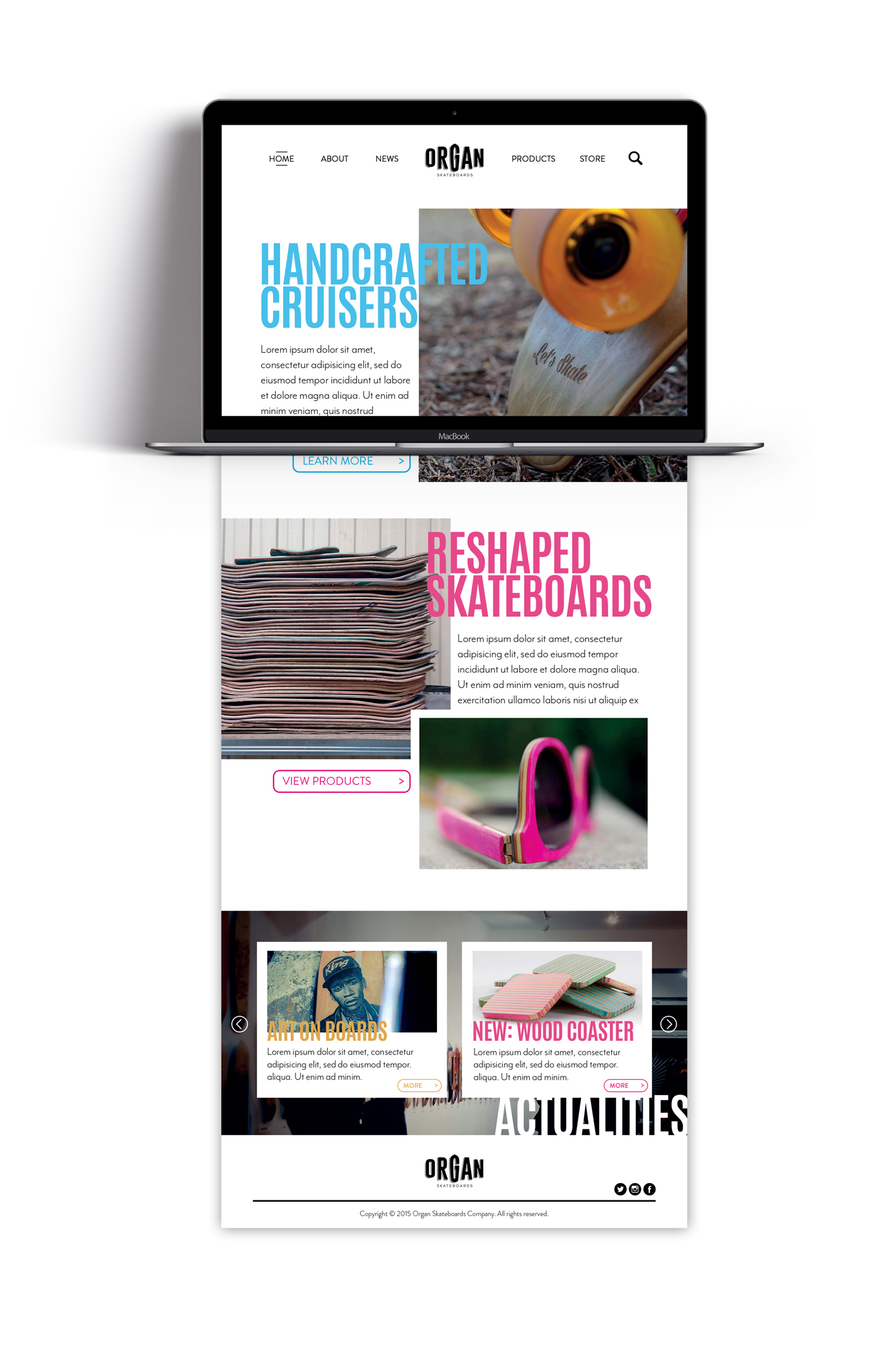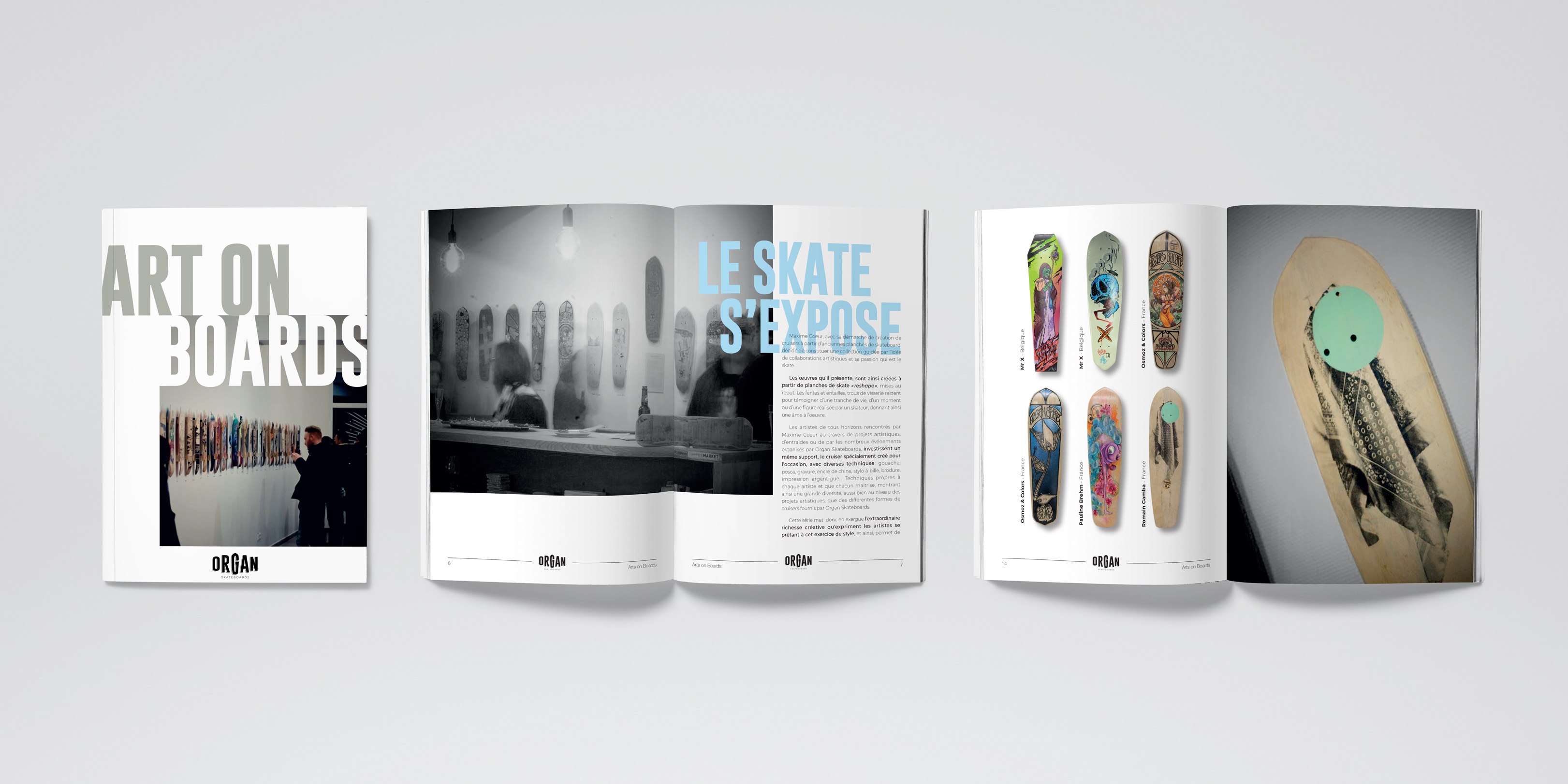 Organ Skateboards est une marque de skate qui crée des cruisers à partir de vieilles planches de skate récupérées. Dans une démarche écologique, tout le bois est récupéré, si bien que les chutes de bois servent aussi à créer divers autres objets (monture de lunettes, coque d’iphone, etc.). Au travers du logotype et du branding développés, les notions de qualité et de haut de gamme du reshape sont représentées par les lignes et le travail autour de la forme particulière de ces cruisers.