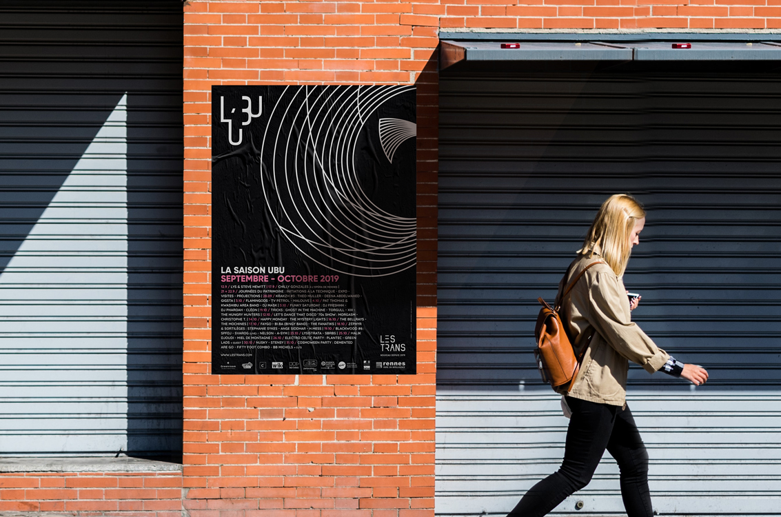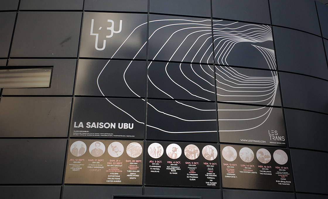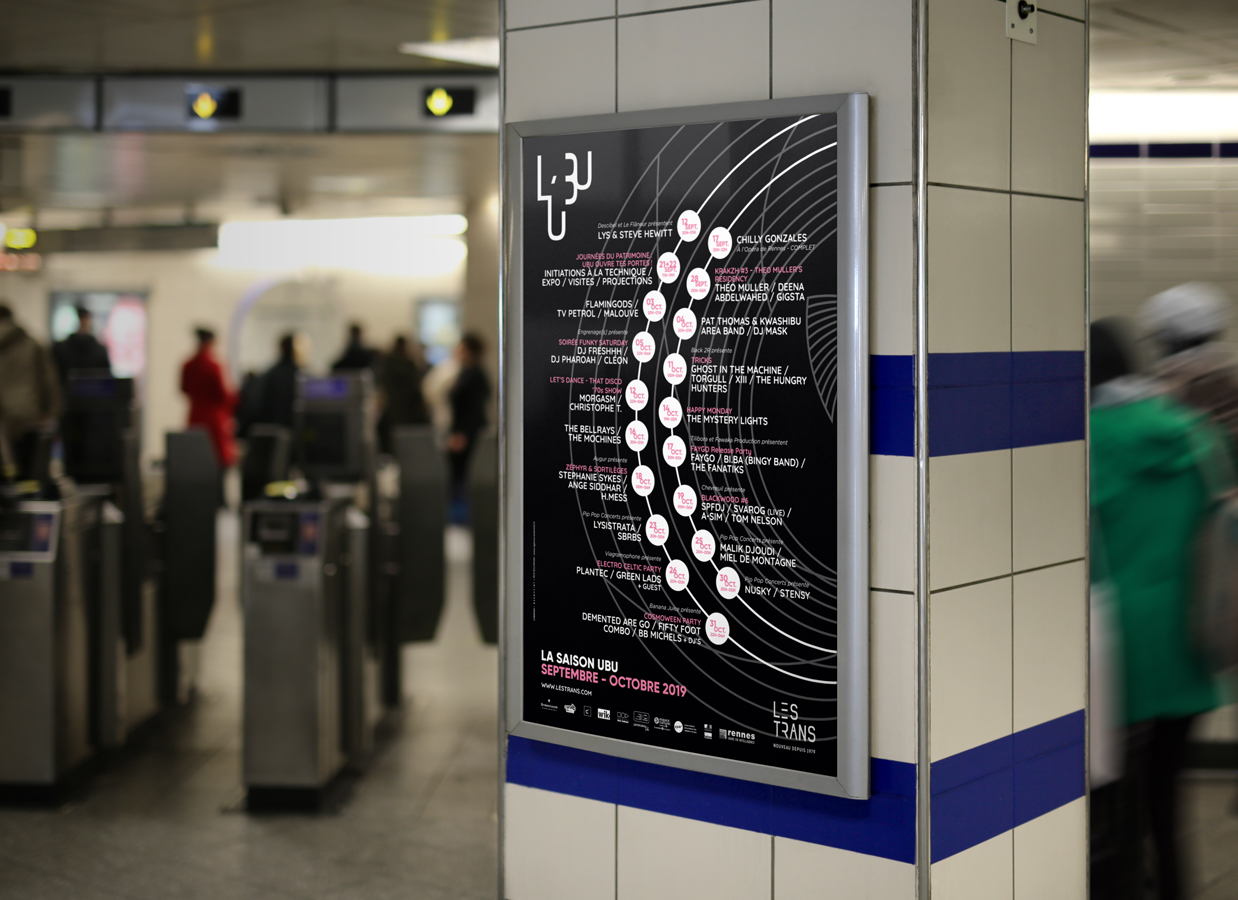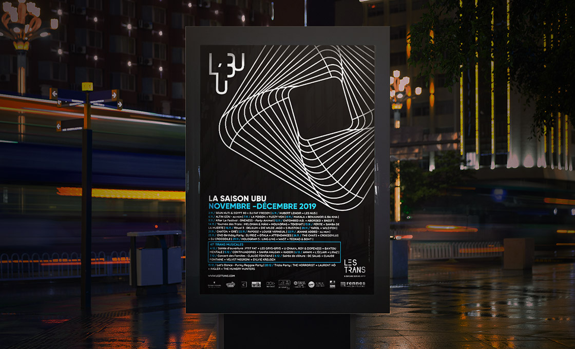 Pour créer l’univers visuel de la salle de concert de l’UBU, un lien évident devait exister avec l’identité du festival Les Trans Musicales. L’enjeu, concevoir un univers parallèle, aux codes visuels en résonance avec ceux du festival afin d’identifier le lien entre ces deux entités de l’association Les Trans.