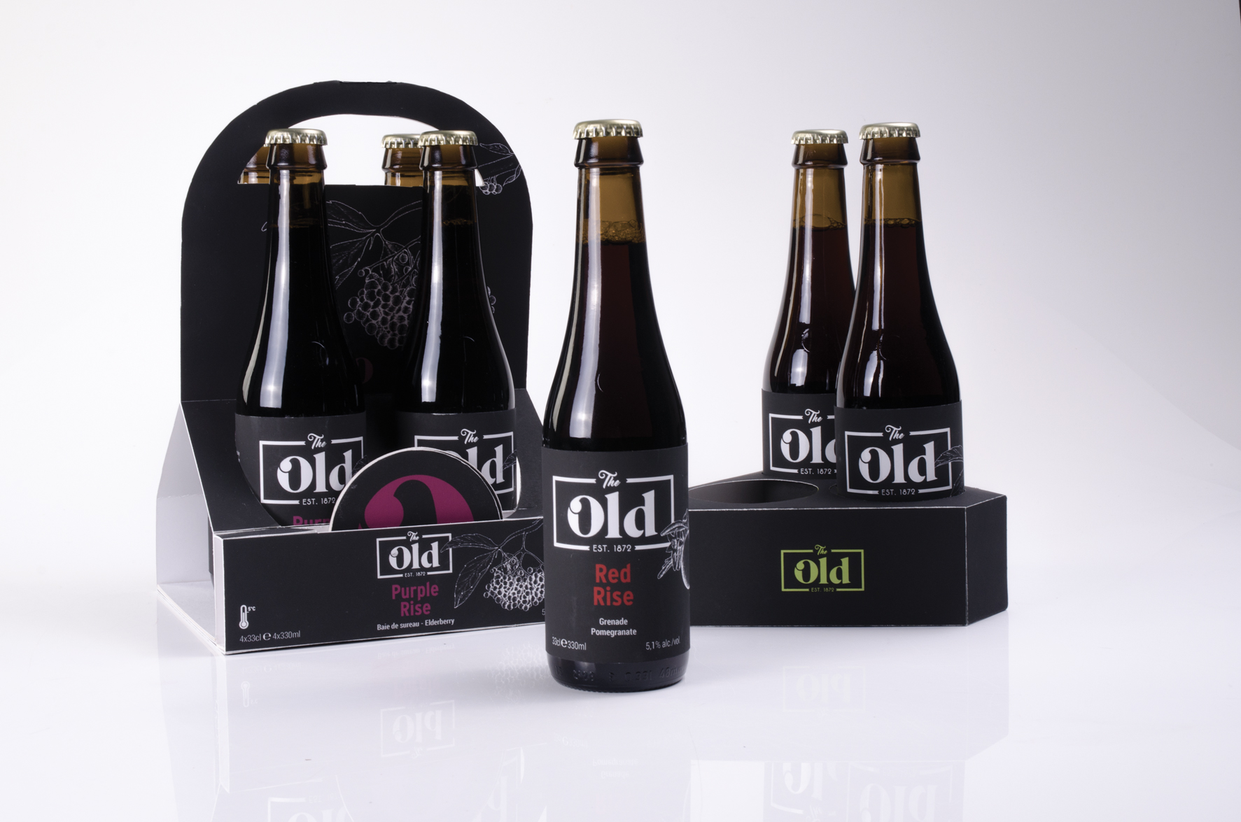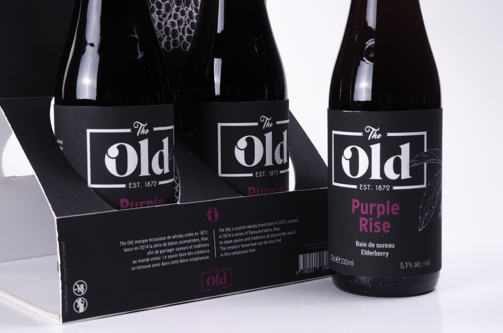 The Old est une marque d’alcool qui lance une nouvelle série de bières, Rise, des bières aromatisées haut de gamme (of high quality), brassées main. La typographie utilisée pour le logo associée aux illustrations, similaires aux anciennes gravures, habillant les packagings permettent de mettre en avant les valeurs de la marque : tradition, haut de gamme et fait-main.